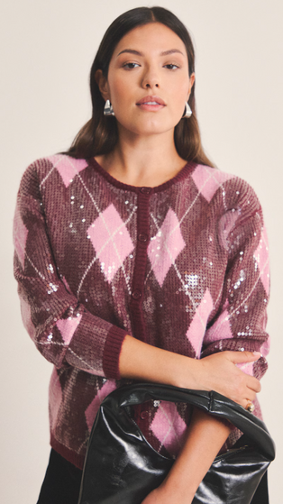 Sequin Heart Fluffy Argyle Boyfriend Cardigan