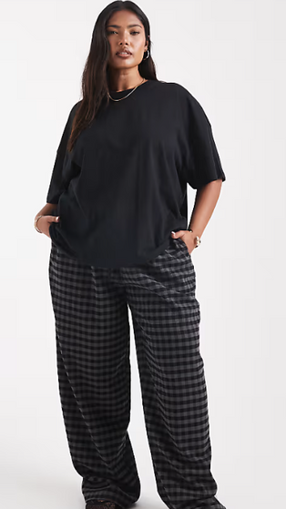 Curve Pull on Tie Waist Barrel Trousers in Black & Grey Check